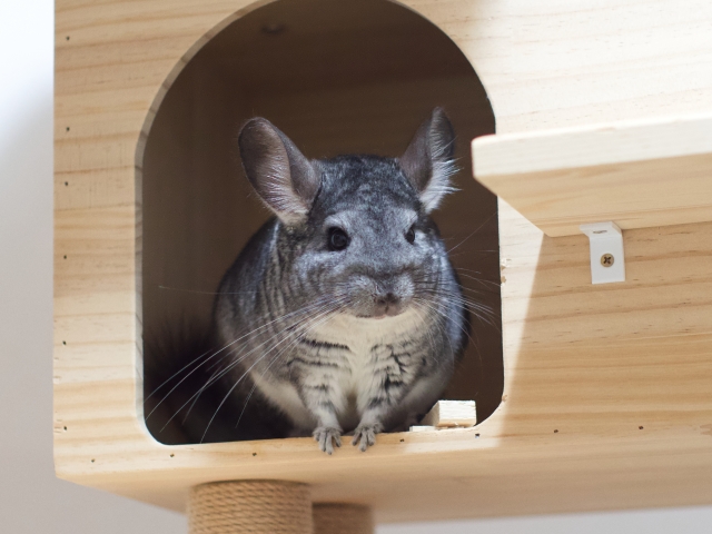 ケージ内には、エサ台と給水器は必須アイテムです。給水器は吊り下げ式のボトルタイプを選び、新鮮な水をいつでも飲めるようにしておきます。また、かじり木や回し車なども設置し、チンチラの運動欲求やストレス解消に役立てましょう。